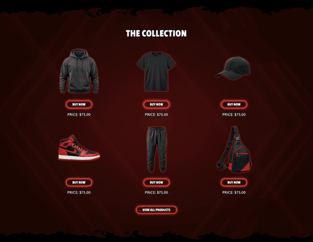 Moving away from static flat-lays to dynamic, floating product compositions with red glow effects. This styling treats every hoodie and sneaker like a rare "item drop" in a video game, increasing perceived value and desirability.
