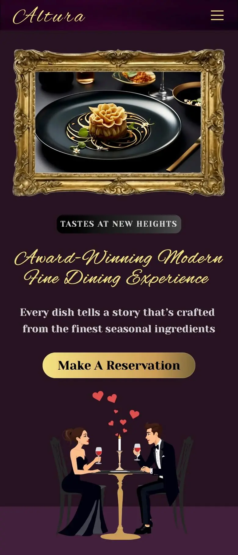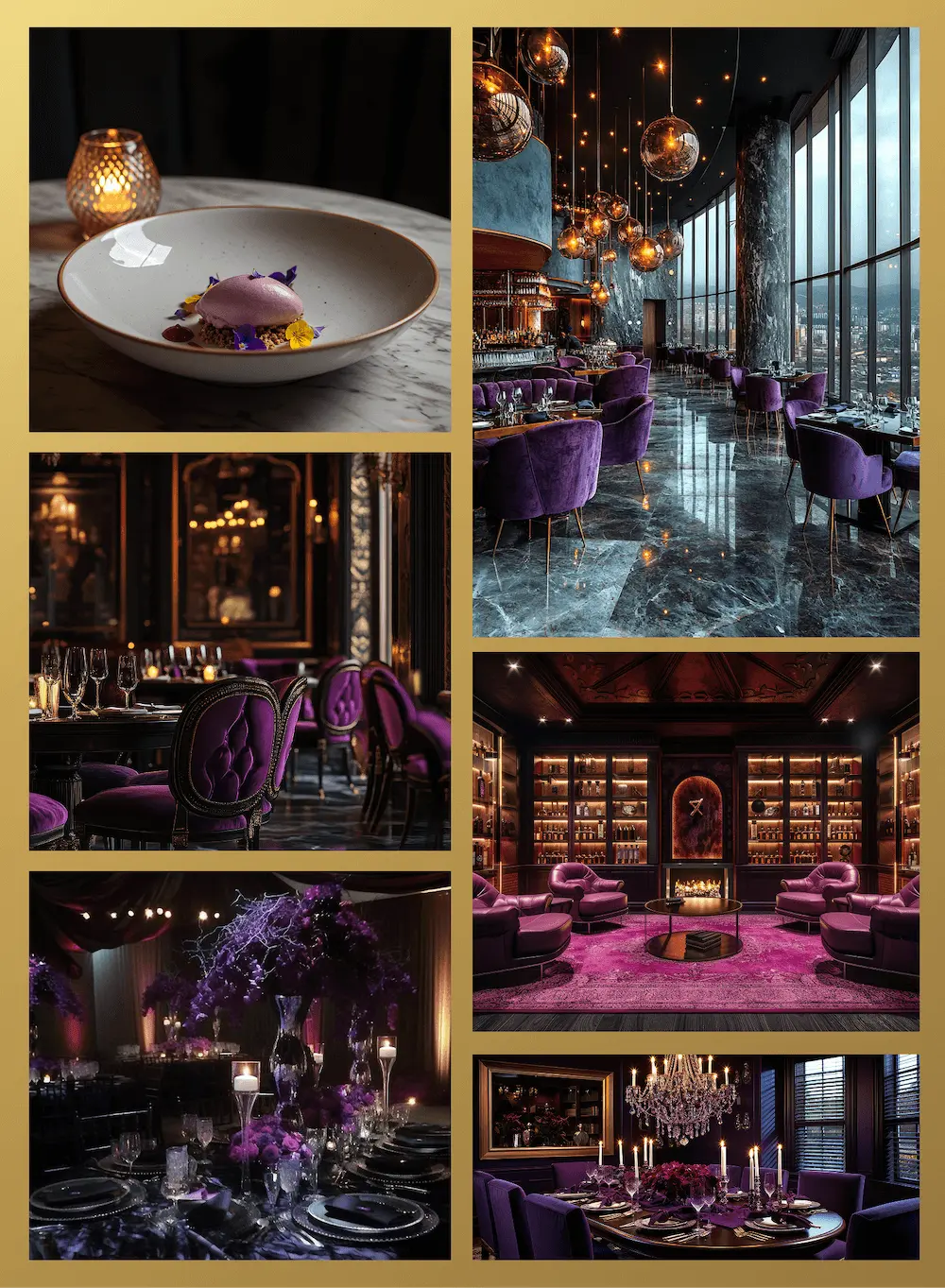 Altura's brand identity embodies sophistication and theatrical elegance. The logo features refined script typography with decorative flourishes, while the rich color palette of deep purple, black and gold evokes royalty, elegance and luxury. The brand voice is refined yet approachable… speaking to discerning diners who appreciate artistry.