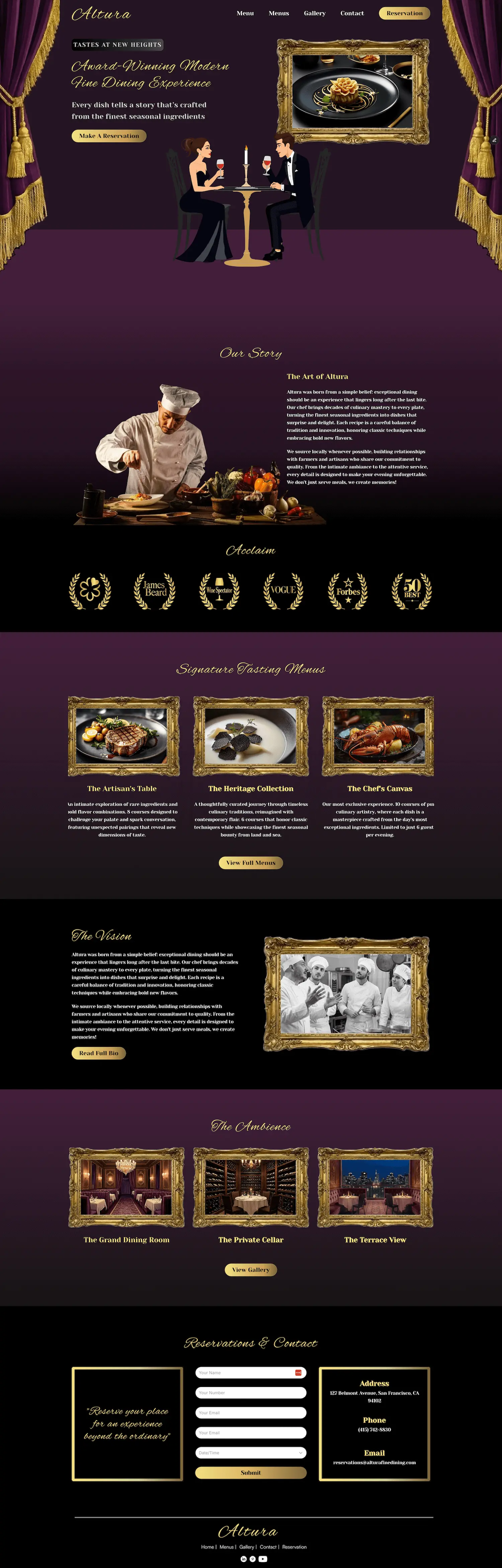 The website unfolds like a curated dining experience. It's dramatic, elegant and visually captivating. Ornate gold frames showcase culinary photography against rich purple and black backgrounds, while thoughtful spacing and classic typography create a browsing journey that feels exclusive and inviting.