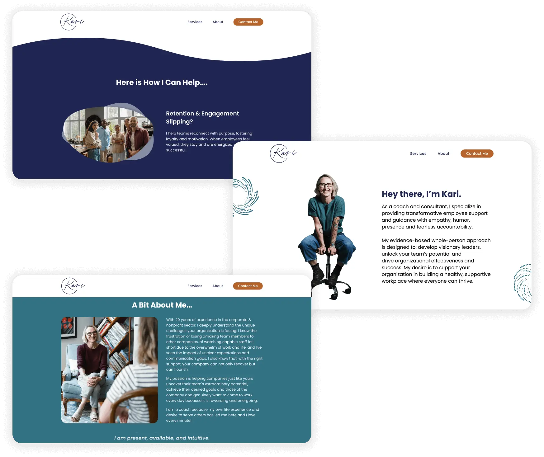 Kari approached me with a clear vision: to create a corporate-facing website that would stand out and reflect her unique coaching style. Her coaching philosophy revolves around providing transformative employee support, combining empathy and accountability to drive organizational success. Our task was to build a website that not only highlighted these qualities but also delivered a seamless and engaging user experience.